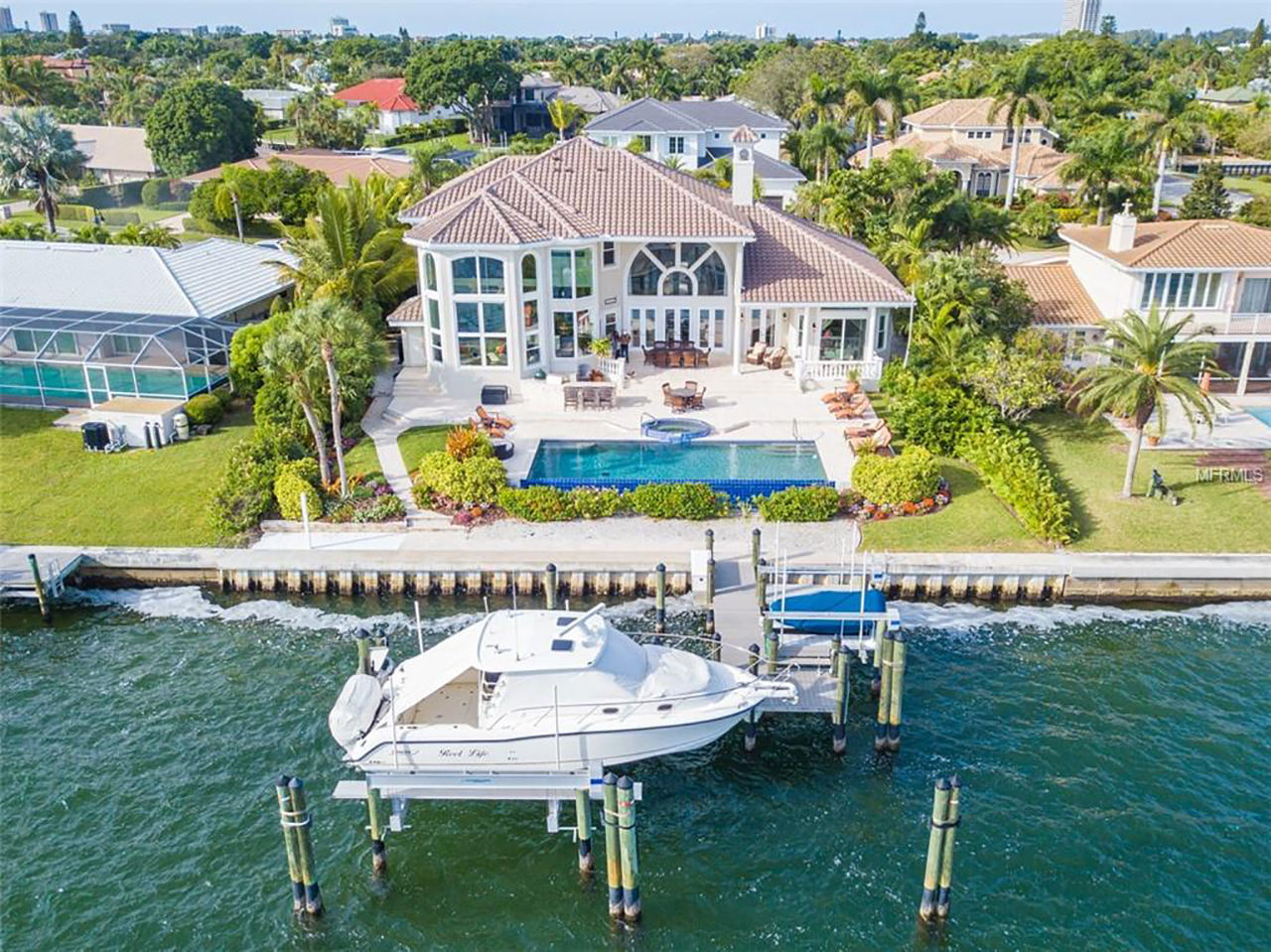 Details: Located on Meadow Lark Drive, known as “The street of Golden Vistas,” this home features a new customized dock with a 27,000 pound lift and is a yachting location has the depth and clarity to accommodate larger vessels.
