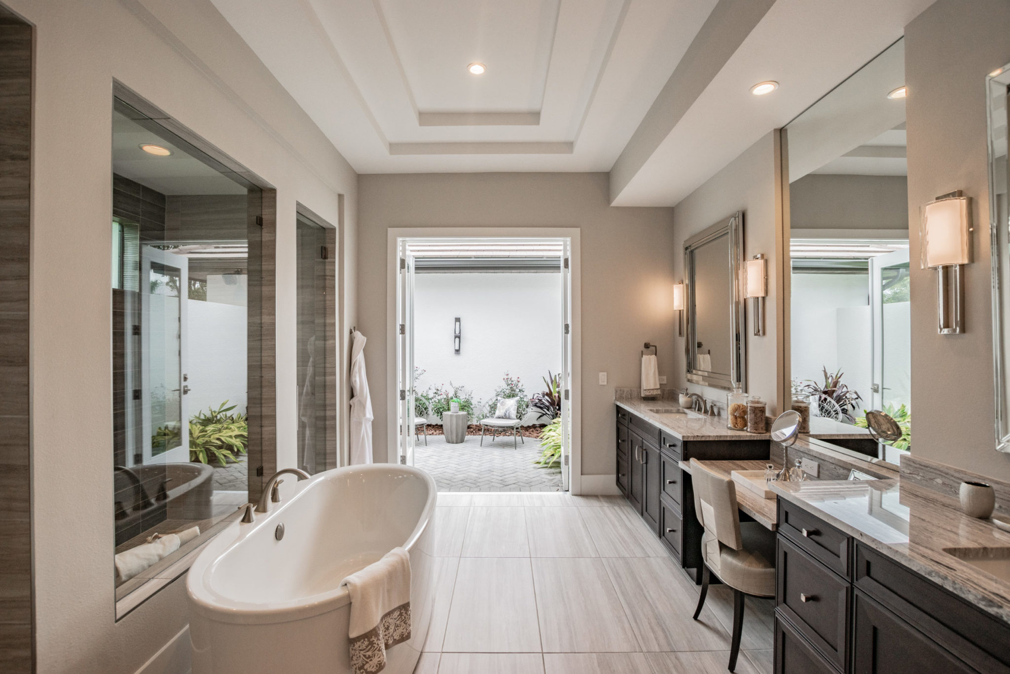The gourmet kitchen has a hidden walk-in pantry and an abundance of work and storage space. The master suite gives the feeling of a private retreat, featuring a 12-foot recessed ceiling, master bath and palm-fringed courtyard.