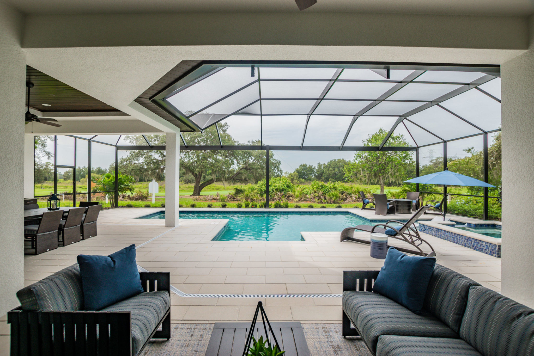 Featuring four bedrooms along with a den and a bonus room, the Kingston’s open design has walls of glass in spacious living areas. A lanai terrace with a pool, spa and summer kitchen is designed with entertaining in mind.