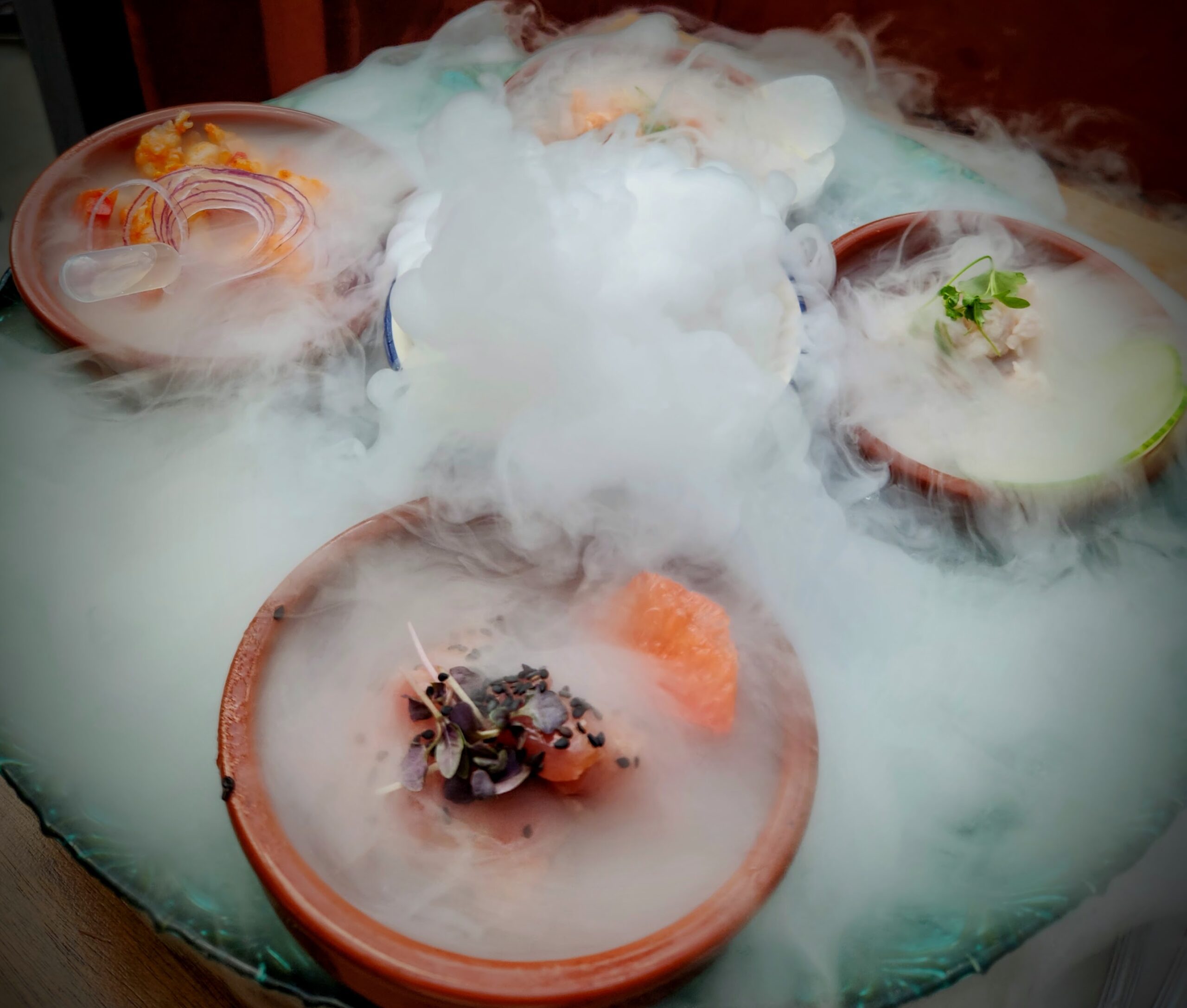McHugh’s new vision for Flor Fina revolves around tableside presentation, putting smoke, and steam, in the spotlight, reminiscent of Ybor’s cigar heritage. The Ceviche Sampler, served over a bed of seaweed, arrives steaming with dry ice with four samples of fresh ceviche, along with a smoked fish dip and plantains.