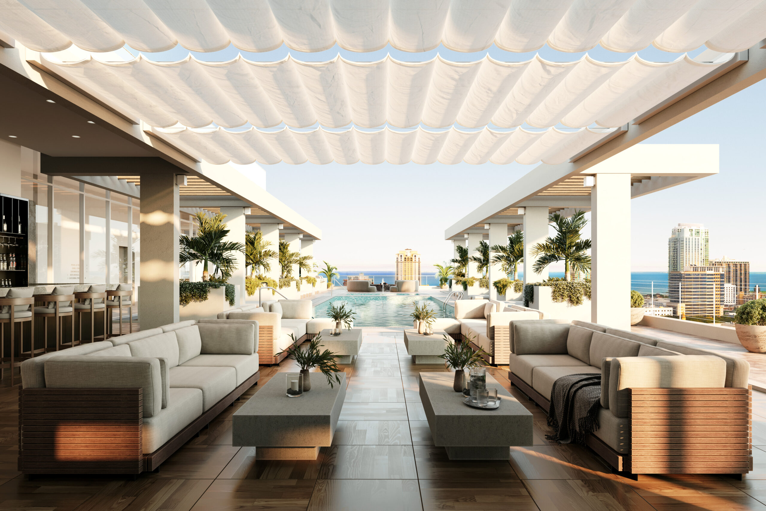 Amenities feature a pool on the roof, a private club poolside and concierge services.