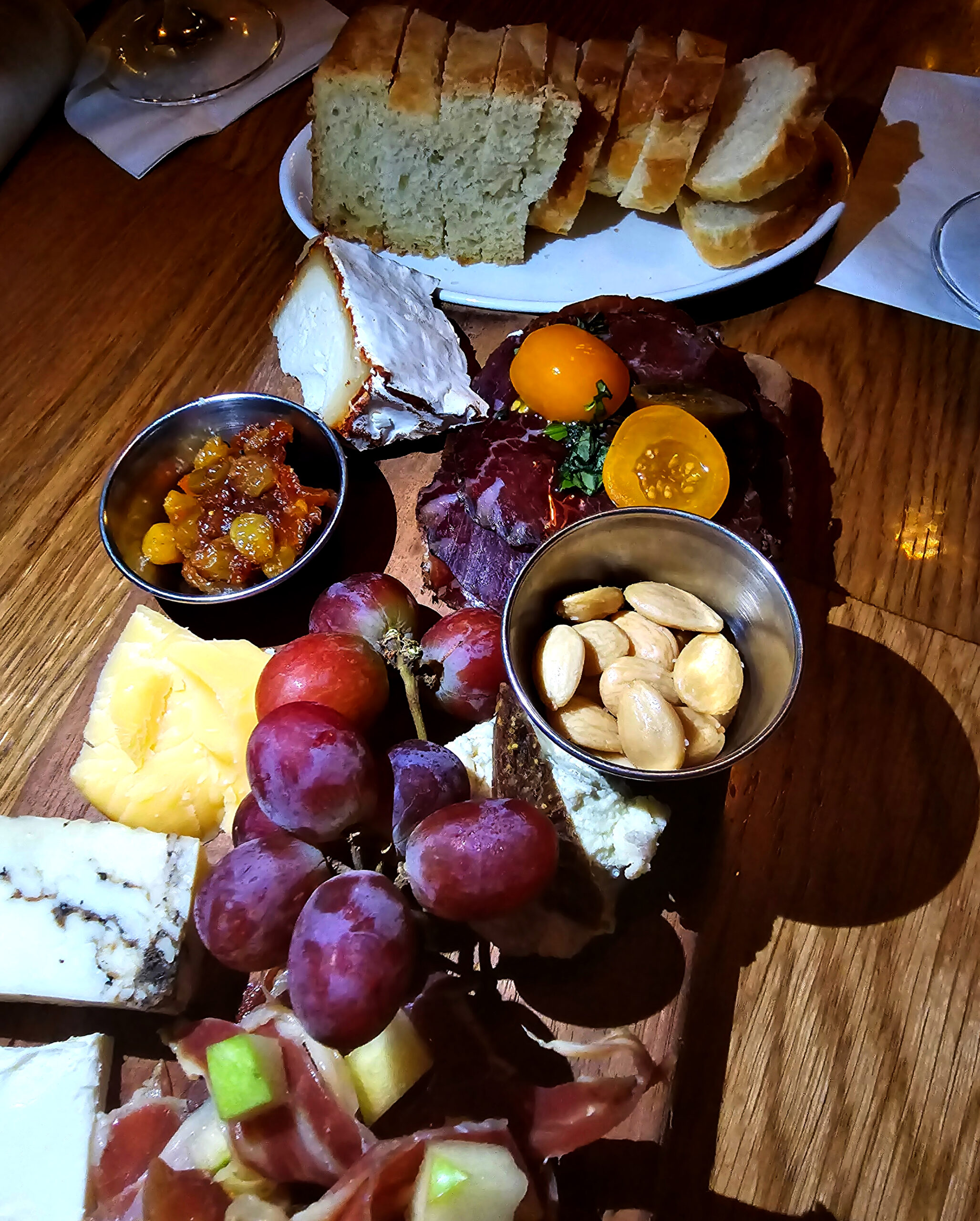 The Truffle Tremor, a standout among California’s artisanal cheeses, is punctuated by flecks of fragrant black truffles combined with the tang of goat’s milk adding a luxurious dimension to its taste profile. The Leonora a Fuego excites the palate with its delicate creaminess and the subtle heat of Spanish paprika. A rare gem, the Rogue River Blue is a pasteurized cow’s milk cheese from Oregon that’s highly allocated and distributed, only once a year. Its unique aging process involves wrapping the cheese in pear brandy-soaked leaves, resulting in a delightful balance of sweetness and the characteristic strength of blue cheese. Complementing the cheeses are the savory Wagyu Bresaola and the Lady Edison Ham, which is expertly paired with apple and truffle honey. Finally, Marcona almonds and raisin chutney provide the perfect accompaniments, rounding out the cheese-tasting extravaganza.