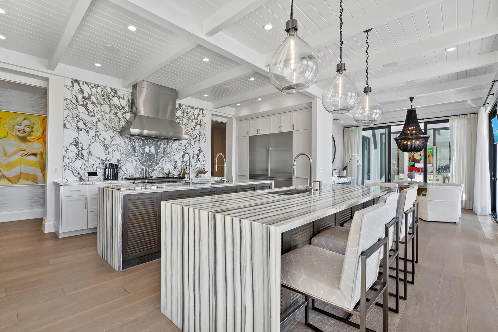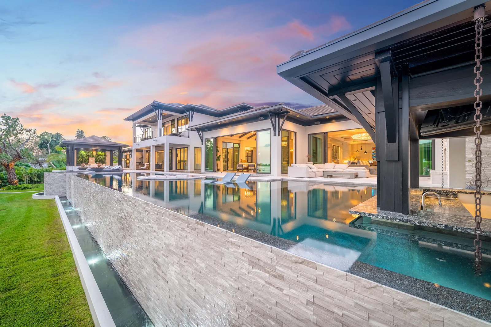 Complementing the interior, the outdoor space has an infinity edge pool, swim-up pool bar, a recessed seating area with fire pit in the pool, a dining pavilion, with a living plant wall, outdoor living room, with a fireplace, spa, outdoor kitchen and a koi pond running almost the entire length of the home, with built-in footbridges.