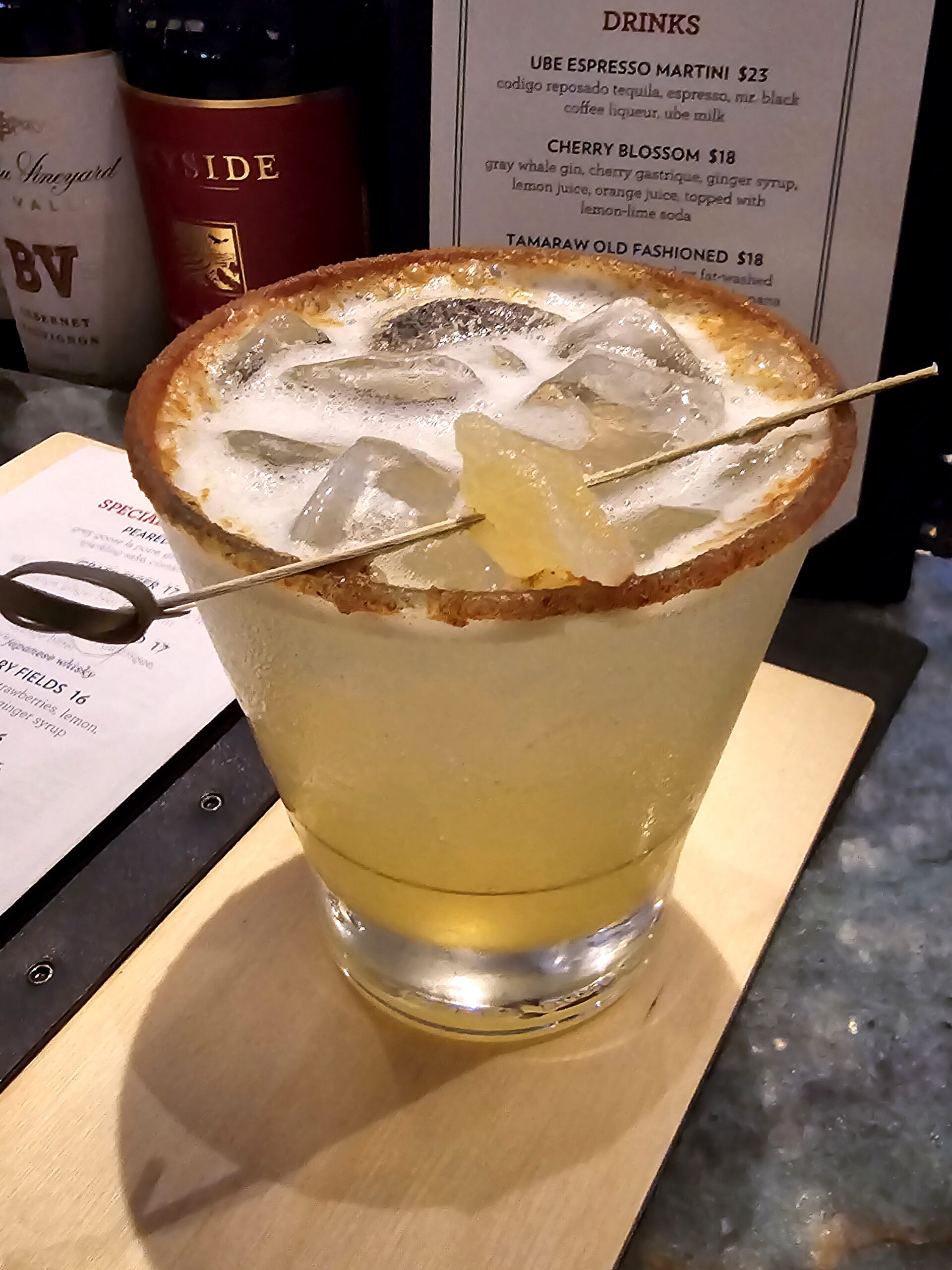 The Peared Sake emerges as a pinnacle of mixological artistry. This sophisticated libation begins with Grey Goose La Poire vodka, its delicate pear notes serving as the foundation for a complex flavor symphony. Lemongrass, lime and orange introduce bright, exotic overtones, while fresh mint provides a cool whisper and Zipang Sparkling Sake imparts a unique depth. Presented with theatrical flair, the glass boasts a cinnamon sugar rim and a dried pear garnish, elevating both visual appeal and taste.