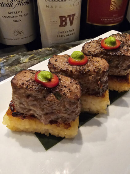 As you savor your expertly crafted beverages, prepare yourself for a truly unique creation that elevates the humble sushi rice to new heights. The Signature Crispy Rice Wagyu highlights the innovative fusion of flavors, for which the restaurant has become renowned. The sushi rice is meticulously pressed and dried for two days, before being seared in clarified butter and deglazed with tamari sambal aioli. This process results in an unparalleled texture that delicately melts on your tongue, while the jus of the Wagyu infuses the rice with its rich, complex flavors.