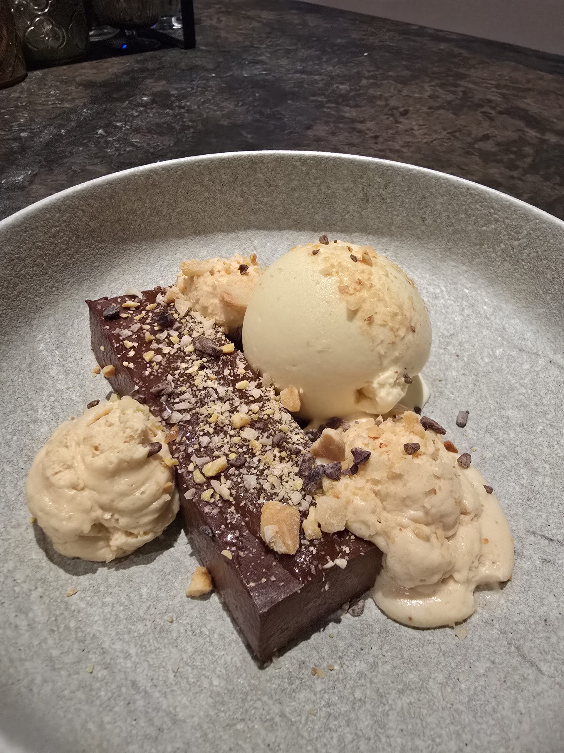 The chocolate ganache, combined with creamy salted caramel ice cream and light peanut butter mousse, is an indulgent treat. The chocolate contrasts beautifully with the sweet, salty caramel while the mousse adds a smooth, nutty finish. With its perfect balance of flavors and textures, this dessert is a luxurious, satisfying way to end any meal.