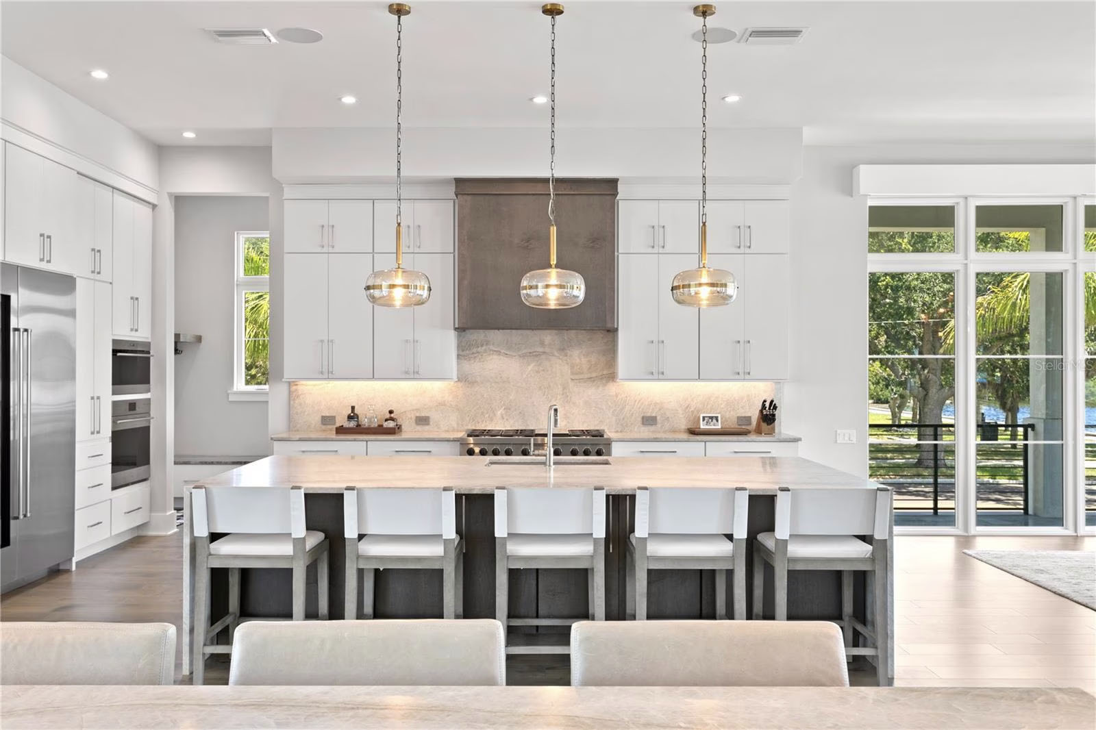 The chef’s kitchen has premium appliances, including a SubZero refrigerator and wine chiller, a Wolf six-burner gas range and a built-in convection oven. Taj Mahal Quartzite countertops and a matching backsplash enhance the elegance of the space.