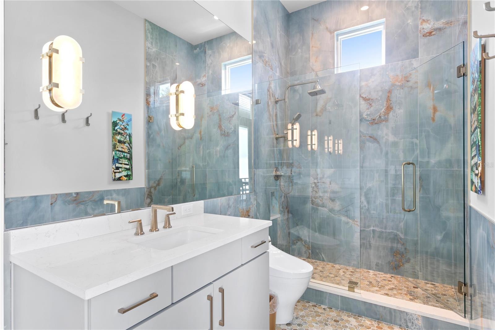The living area is anchored by a custom marble media wall featuring an 85-inch framed television, surround sound and a built-in fireplace. Upstairs, the primary suite has a private balcony, two custom walk-in closets and an ensuite bathroom with marble floors, a soaking tub, a multi-head shower and a wet bar, with a beverage refrigerator.