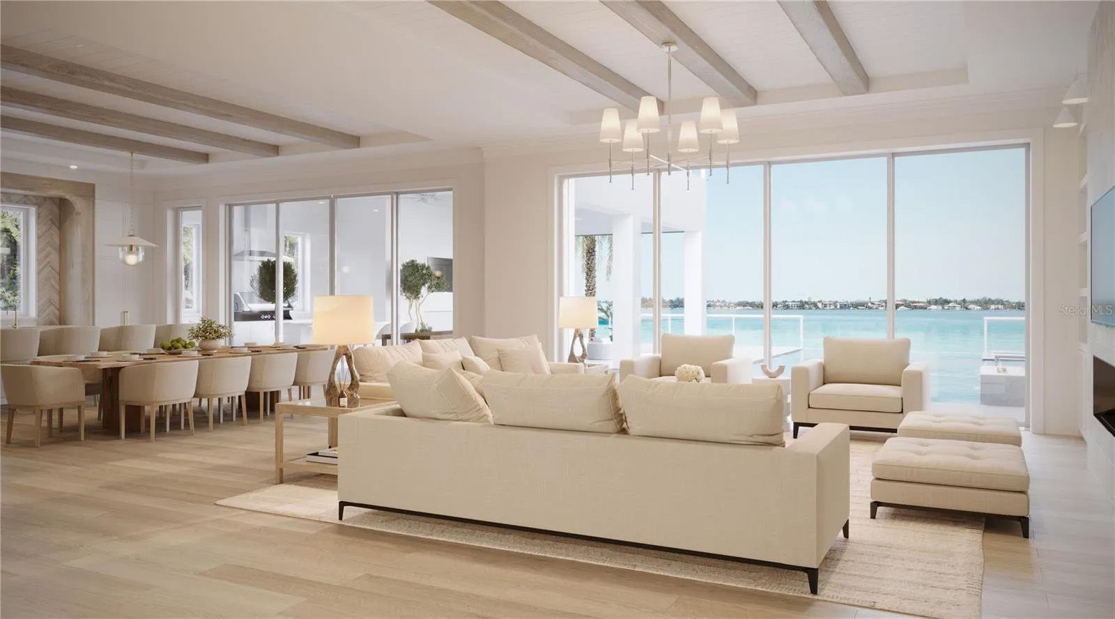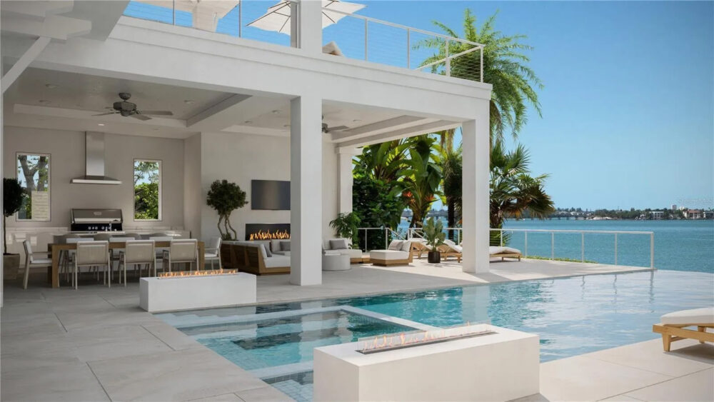 The 6,500-square-foot bayfront home at 1490 Hillview Drive includes five bedrooms, 5.5 bathrooms, a three-car garage, a whole-house generator and elevator access to all levels. Designed by Stephen Balut, in collaboration with MHK Architects, and built by Voigt Brothers Construction, the residence sits on a half-acre lot with 100 feet of south-facing waterfront on Sarasota Bay.
