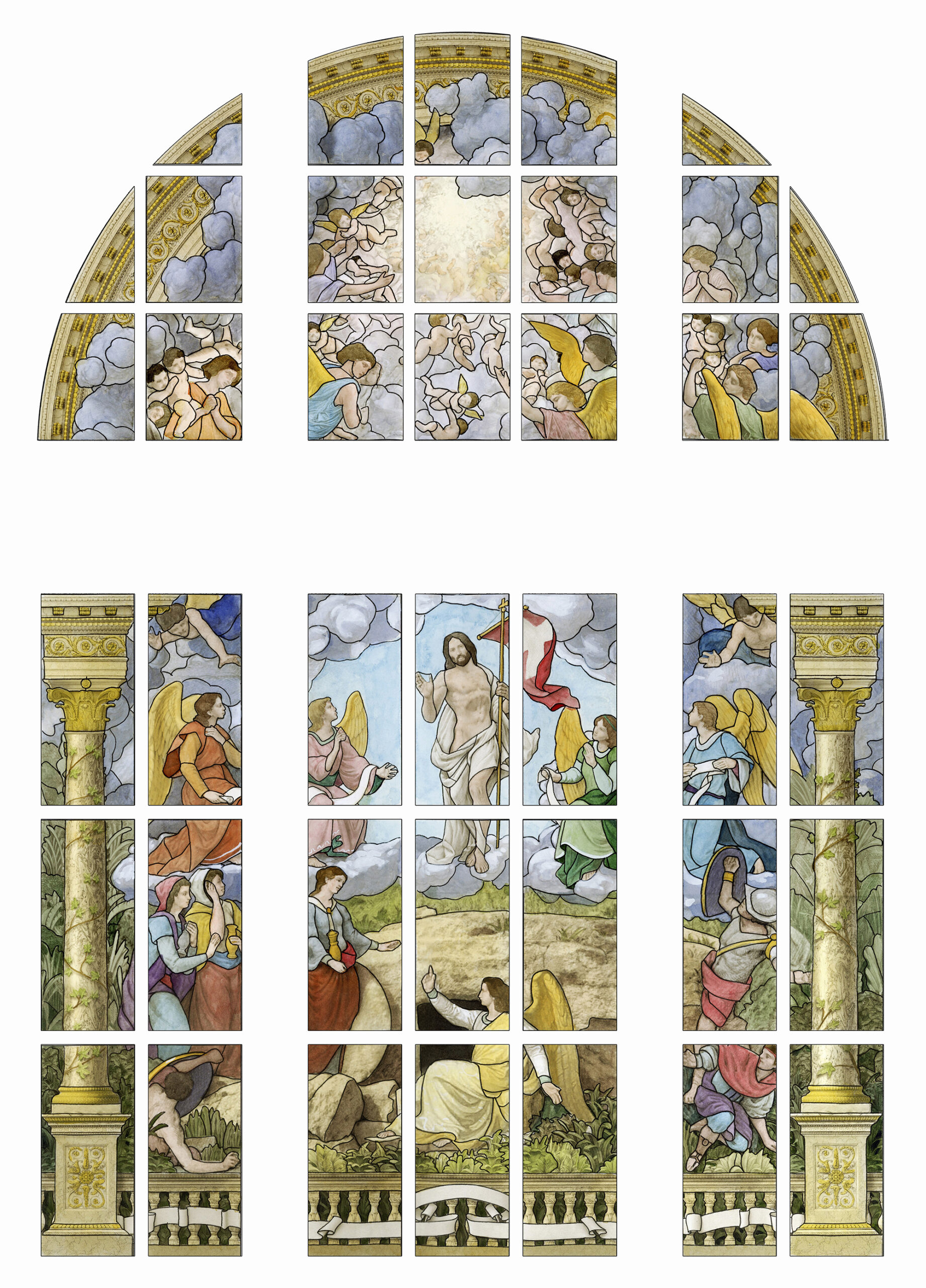 The stained-glass windows were designed by American artist Kurt Wenner and will be installed this summer by Wisconsin-based Conrad Schmitt Studios. The windows will span the north and south walls of the 950-seat chapel, adding to earlier work above the altar and choir loft completed by the same studio.