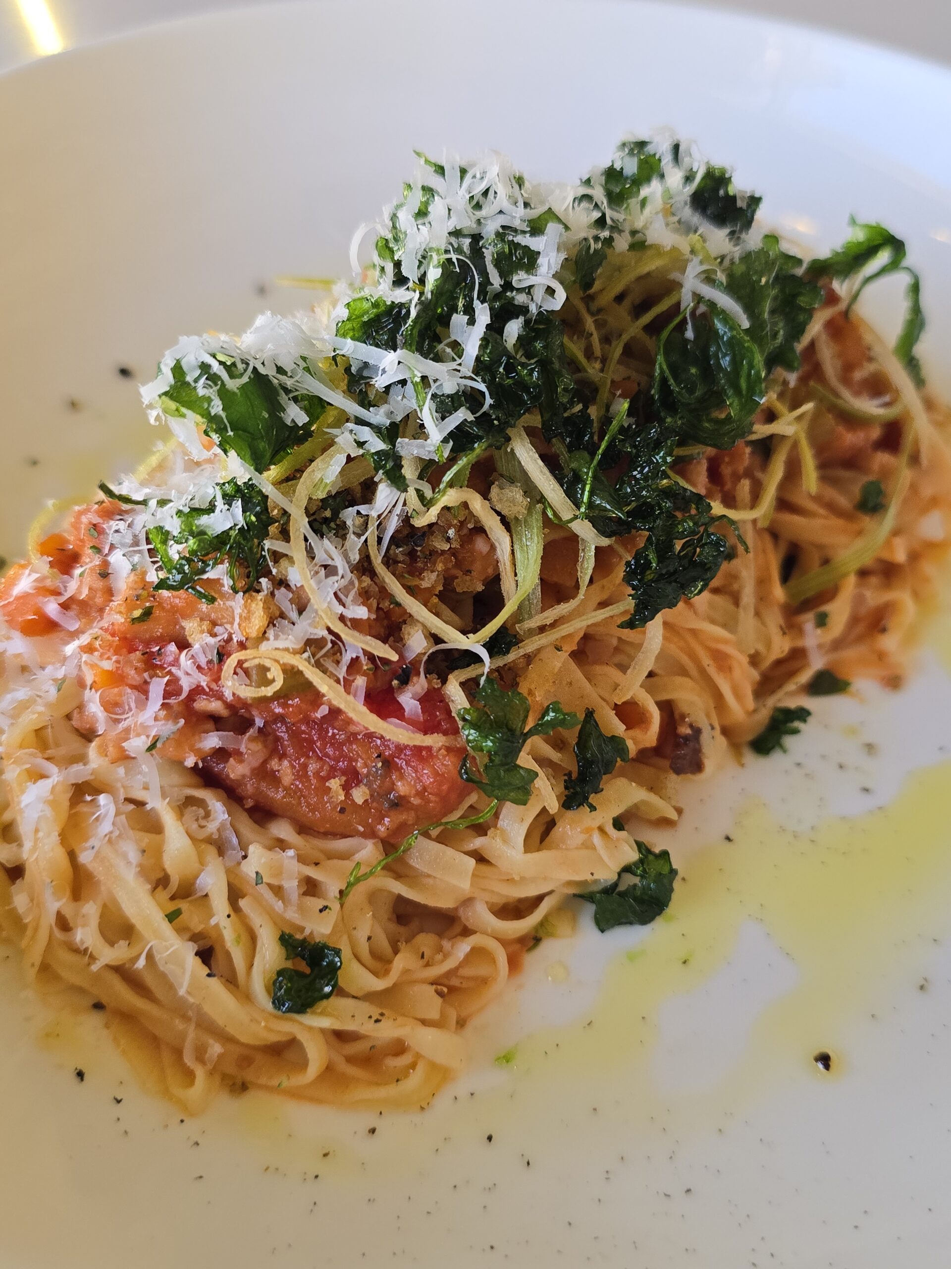 The Chitarra Bolognese redefines coastal Italian cuisine with an unexpected conch ragu. The dish marries the oceanic depth of conch with the rustic comfort of Bolognese. Bone marrow adds richness, while toasted anchovy crumbs bring textural contrast, transforming a familiar pasta into something extraordinary.