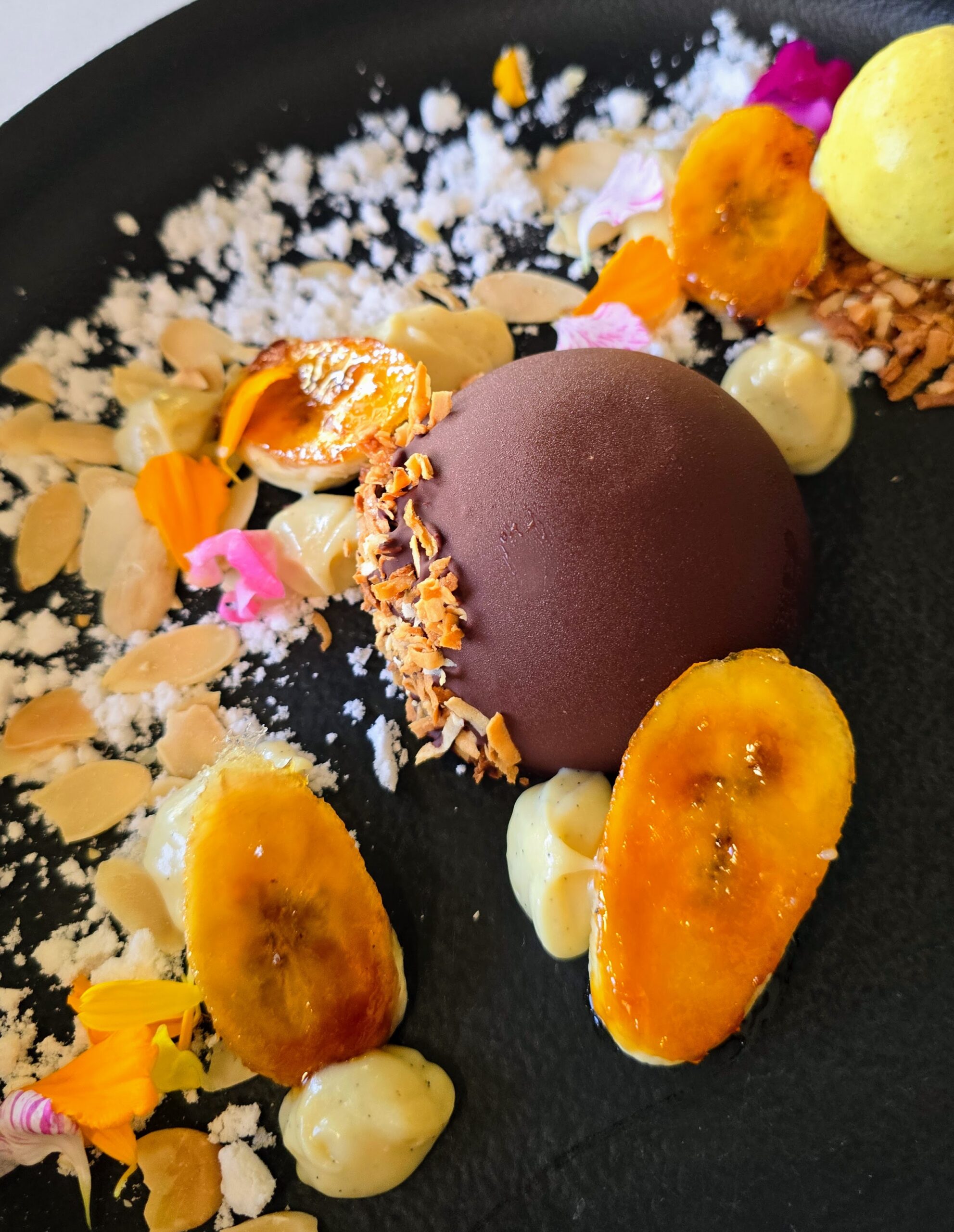 For dessert, the Banana Bombe is Pierola’s tour de force: candied coconut, almond crème pâtissière and caramelized bananas crowned with coconut snow. Curry-roasted banana ice cream lends unexpected complexity, transforming familiar flavors into something unforgettable. Every dish arrives as a meticulously crafted composition — guests often pause before disturbing its perfection.