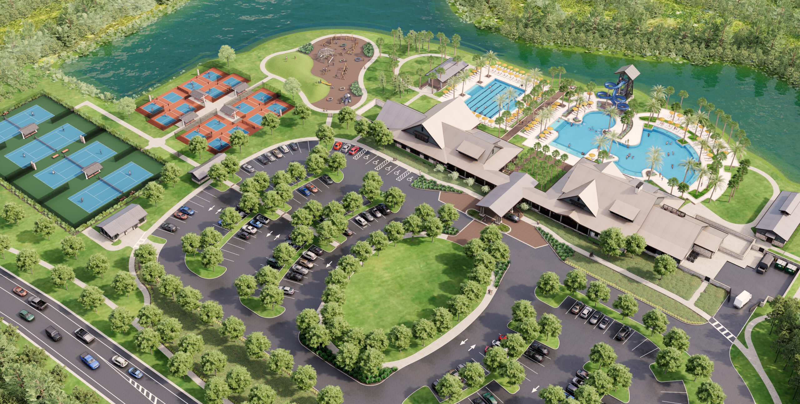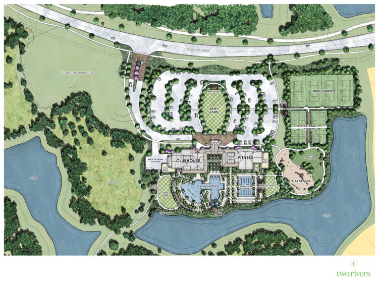Designed as a high-end lifestyle hub, the 23,000-square-foot club will offer exclusive amenities for residents of select Two Rivers neighborhoods. Features include eight pickleball courts, four Har-Tru tennis courts, a fitness center with spin and yoga rooms and two pools, one for laps and another with a water slide tower for families.