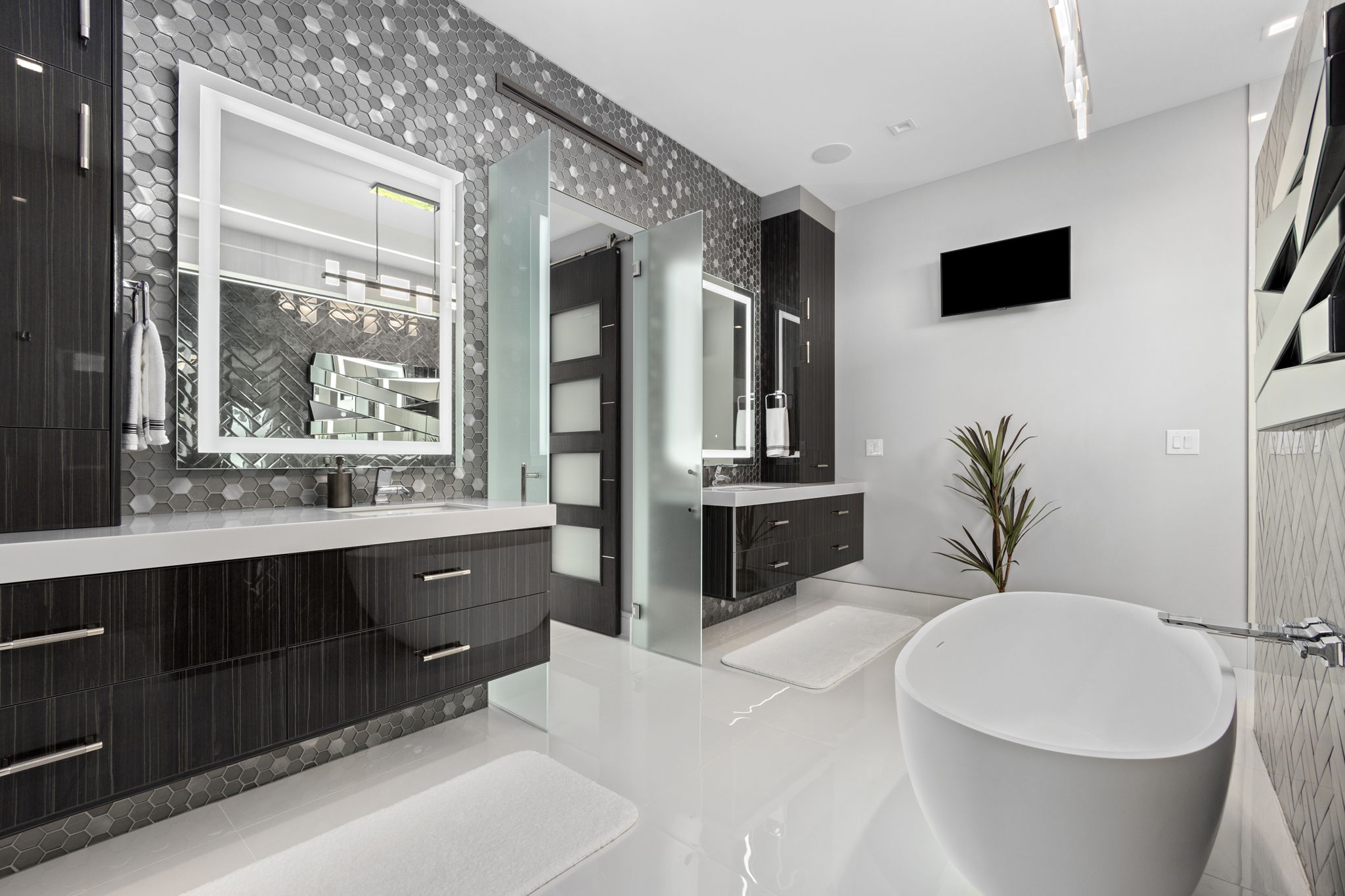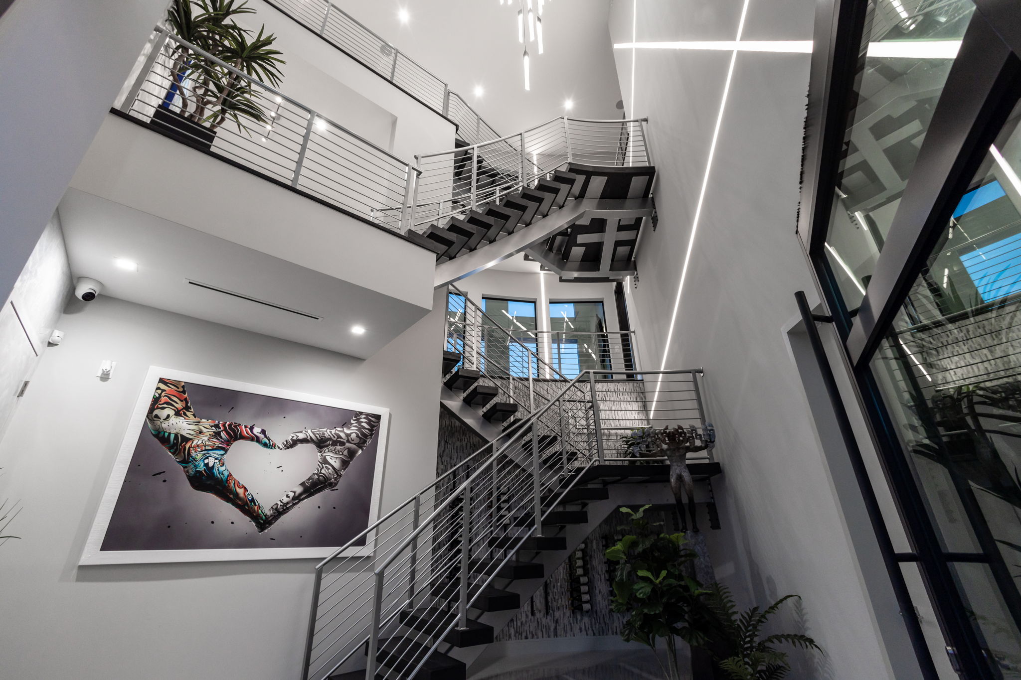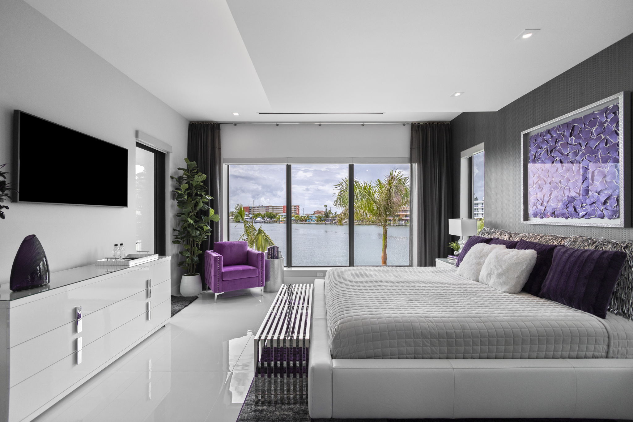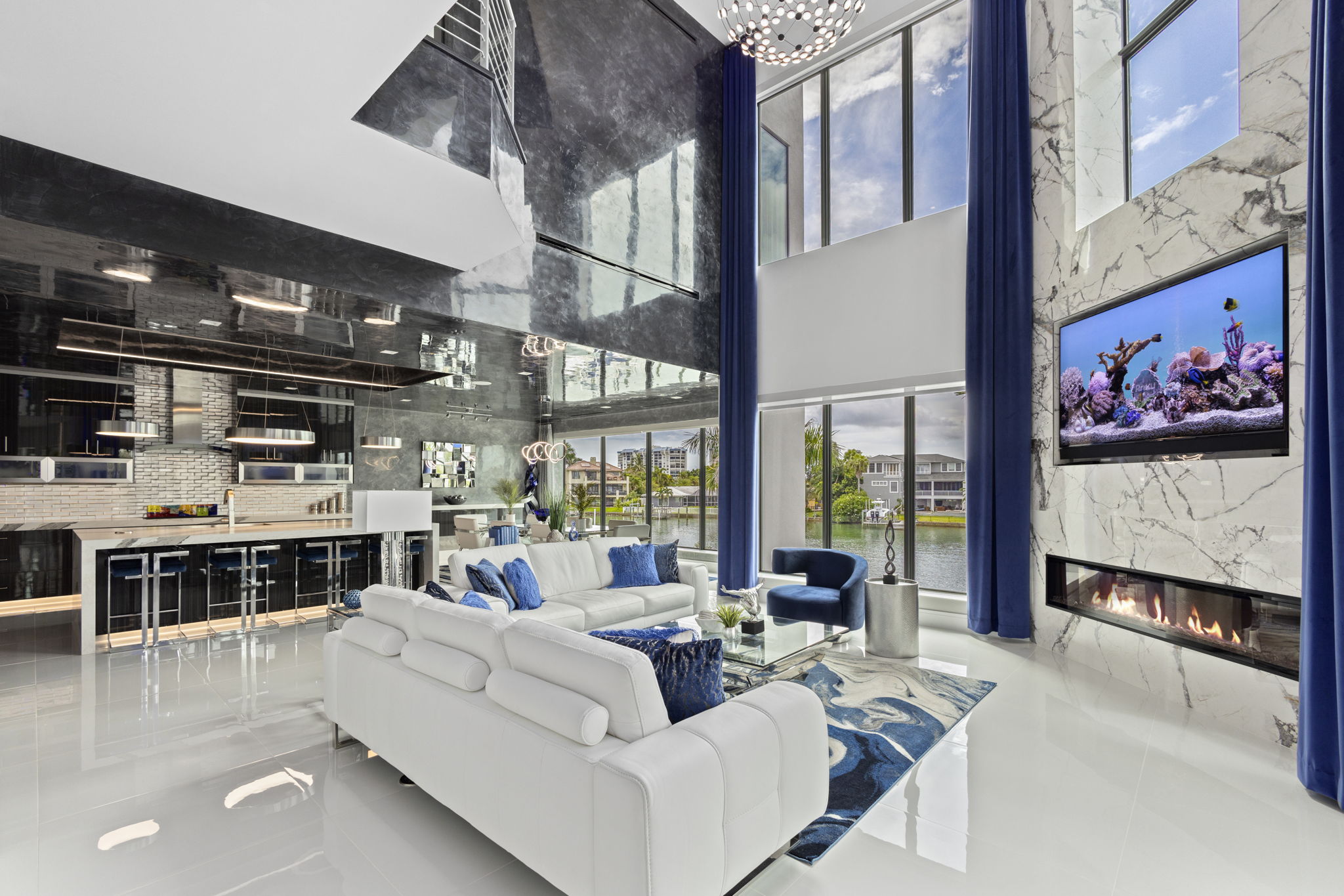 The main floor offers a two-story great room, with combined living and dining spaces, highlighted by a 74-inch linear gas fireplace and an Italian Luceplan chandelier, along with panoramic water views. The kitchen includes high-gloss cabinetry, granite countertops, a 9-foot central island and premium appliances by Sub-Zero, Wolf, Cove and Marvel. A separate butler’s pantry houses a Thermador coffee and espresso machine.