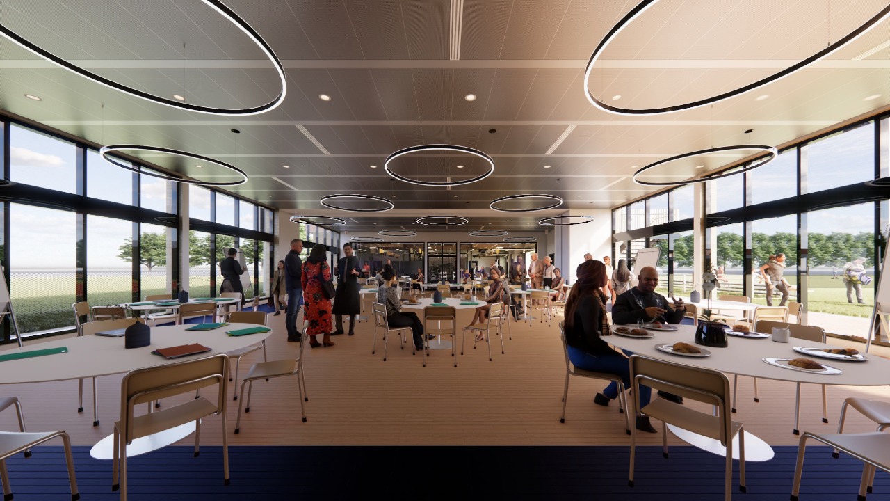 A full kitchen will support both nutrition education and game-day concessions. The design includes natural light and roll-up doors that open to the adjacent athletic field.